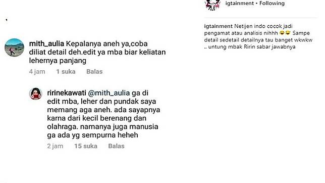 "Nggak diedit mba, leher, dan pundak saya memang agak aneh. Ada sayapnya karena dari kecil berenang dan olahraga. Namanya juga manusia nggak ada yang sempurna," tulis akun Ririn Ekawati.
