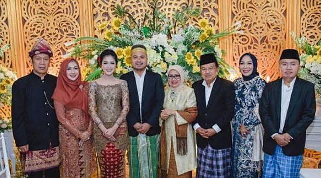 Wakil Presiden Jusuf Kalla hadir dalam acara lamaran yang menggunakan adat Bengkulu. Affie Kalla dan Tistha foto bersama dengan keluarga.