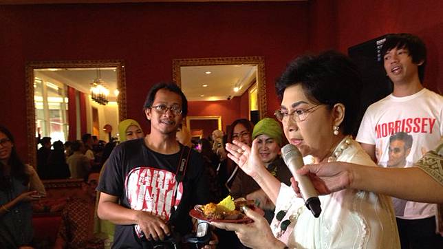 Setelah selesai berdoa dan memotong tumpeng, Titiek menyempatkan diri untuk memberikan sepotong tumpeng untuk salah satu perwakilan wartawan.