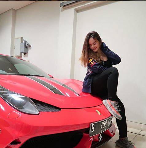 Tak hanya itu saja mobil yang dimiliki keluarganya. Shafa yang menggunakan celana hitam dan baju hitam yang ditutupi bomber jacket terlihat duduk di atas sebuah mobil Ferrari 458 Spider berwarna merah.