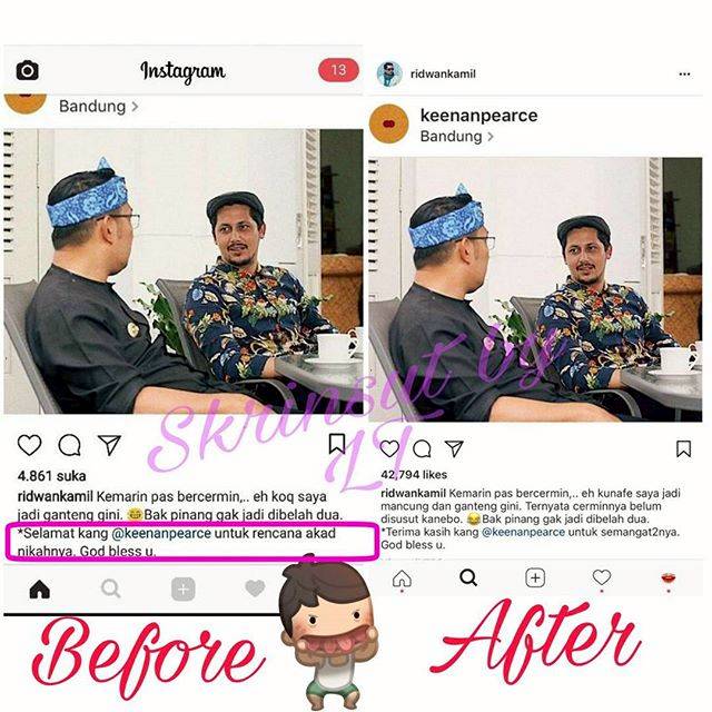 Lewat keterangan foto yang Tribunstyle.com lansir dari akun Instagram @lambe_turah, Kang Emil tampak memberikan selamat pada Keenan untuk rencana akad nikahnya.