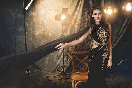 Dengan hairdo kece dan makeup yang flawless, bintang film horor THE DOLL ini tampak begitu memukau dalam balutan gaun hitam. Busana dengan potongan unik dan payet indah ini makin kece dengan tambahan jubah pada bagian belakang.