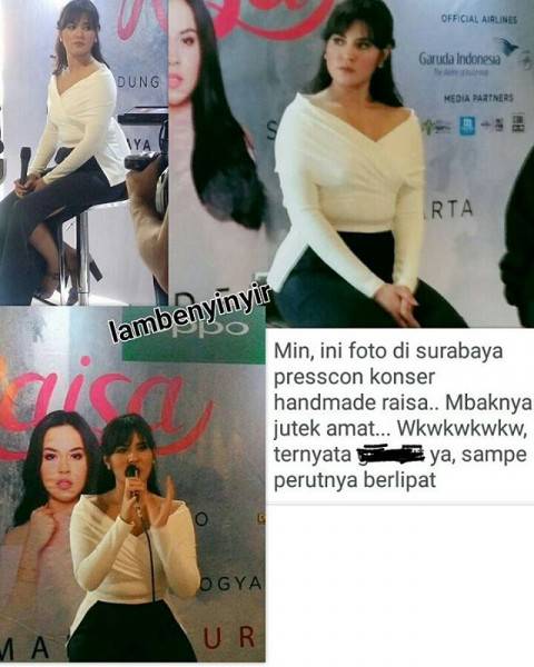 3. Saat melakukan konser album Handmade di Surabaya, Raisa diejek semakin gendut. Warganet tersebut juga menyebutkan bahwa lipatan perut Raisa ini sampai terlihat. Raisa pun membalas postingan tersebut, "hey…hope your life will be filled with love & respect always."