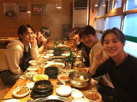 Ada pula momen di mana Jonghyun bersama para member SHINee tengah makan bersama. Pamerkan senyum ceria, momen bahagia ini terlihat begitu menyenangkan.