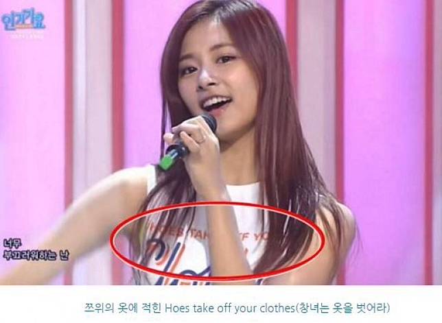 Pada saat tampil menyanyikan lagu ‘gee’ dari SNSD, Tyuzu menggunakan kaus putih dengan tulisan “hoes take off your clothes.”