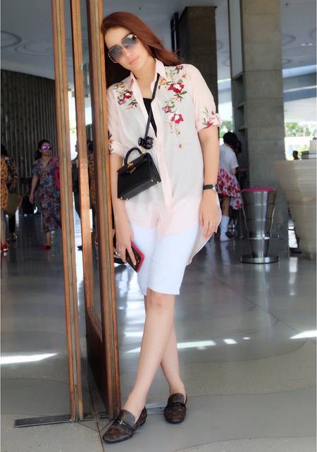 Ussy sendiri memilih untuk mengenakan dress simple warna putih yang dipadukan dengan mini sling bag dan sepatu kasual. Tak lupa ia juga kenakan kacamata hitam untuk hindari silau sinar matahari.