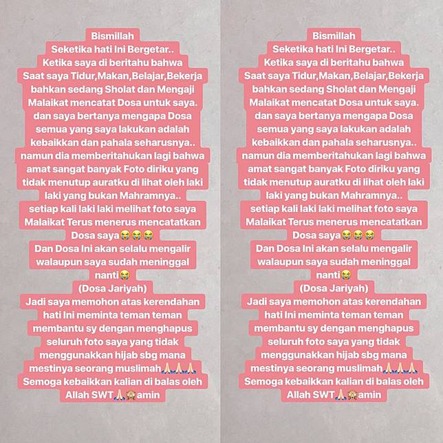 Kalimat panjang yang ia ketik dengan background merah jambu tersebut bertuliskan permintaan pada semua orang untuk menghapus semua fotonya yang memperlihatkan auratnya.