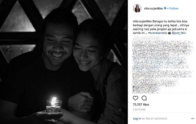 Tak sampai di situ saja, Chicco memang sering menuliskan kalimat manis sekaligus kocak untuk Putri. Sama halnya dengan potret hitam-putih yang menunjukkan keduanya tengah menatap sebuah lilin. 'Bahagia itu ketika kita bisa berbagi dengan orang yang tepat. Contohnya sepiring nasi pakai jengkol saja jadi sama si cantik ini', pujinya. Duh bikin baper ya pasangan yang satu ini.