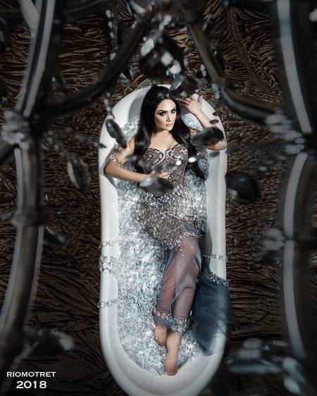 KD berfoto dengan konsep terlentang di dalam bathtub yang berisikan manik-manik seperti diamond.