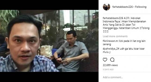 "Halo saya Farhat Abbas bersama dengan ketua dan pendiri AIR (Advokat Indonesia Raya). Menurut pendapat saya, Syahrini sangat mengganggu. Tidak ada orang yang tidak merasa terganggu. Jangankan orang yang di jalan tol saat itu, saya aja yang nonton selfie-nya pun sangat terganggu. Dan dalam waktu dekat ini, Advokat Indonesia Raya, Hendra dan Rudi akan melaporkan Syahrini, pidana tentang mengganggu ketertiban umum di jalan Tol," kata Farhat Abbas.